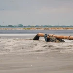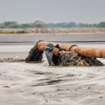 No es el único sitio donde se deposita el sedimento para el relleno hidráulico. A 800 metros de ahí, en el lugar denominado Terrenos Particulares un nuevo ramal de la tubería que se conecta con la draga en el río está trasportando sedimento hasta ese sitio.