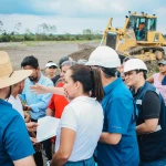 Más tarde, la Prefecta se trasladó a Marcelino Maridueña, donde más de 400 familias del recinto La Modelo se benefician con los trabajos de encauzamiento y protección de ribera en 1.5 km en el río Chanchan, para cuidar más de 3 mil hectáreas de cultivos de caña de azúcar y plátano.